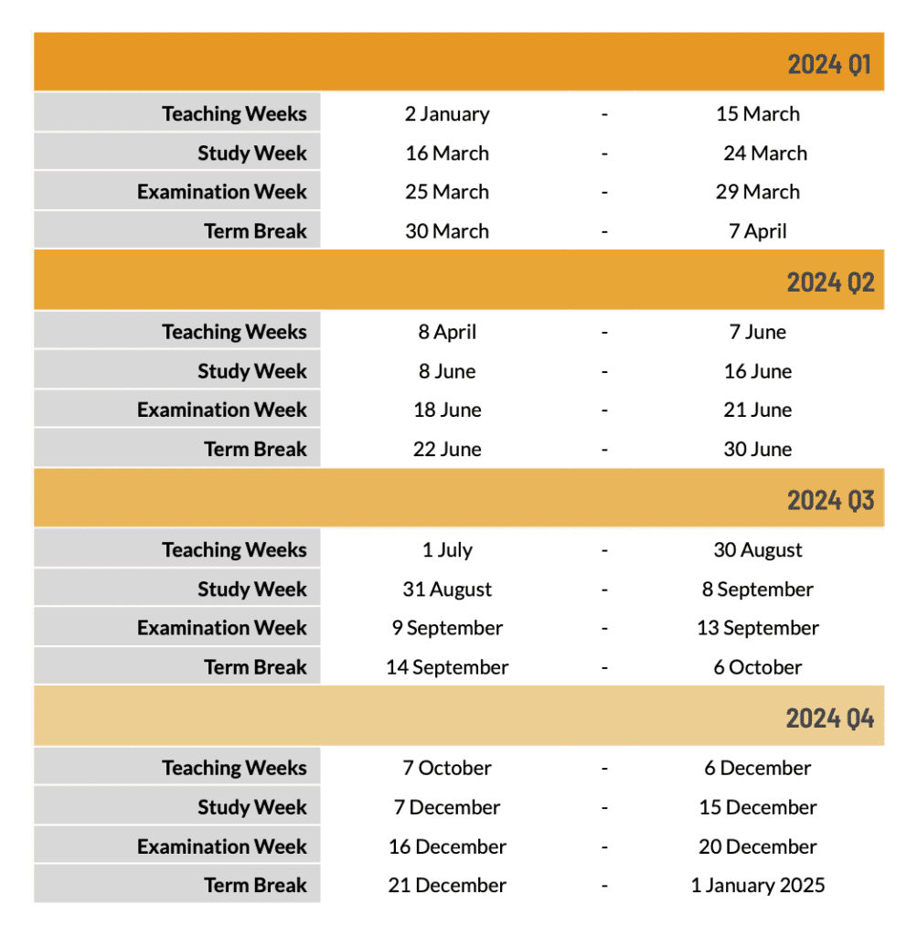 Typically, an academic calendar comprises of two semesters. Each semester spans 9 weeks of lessons, followed by 1 study week, 1 exam week, and 1 week of break.