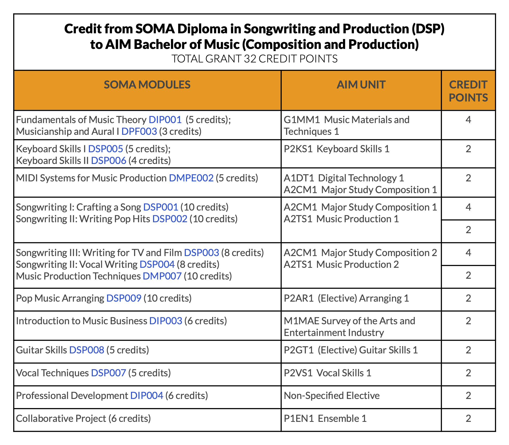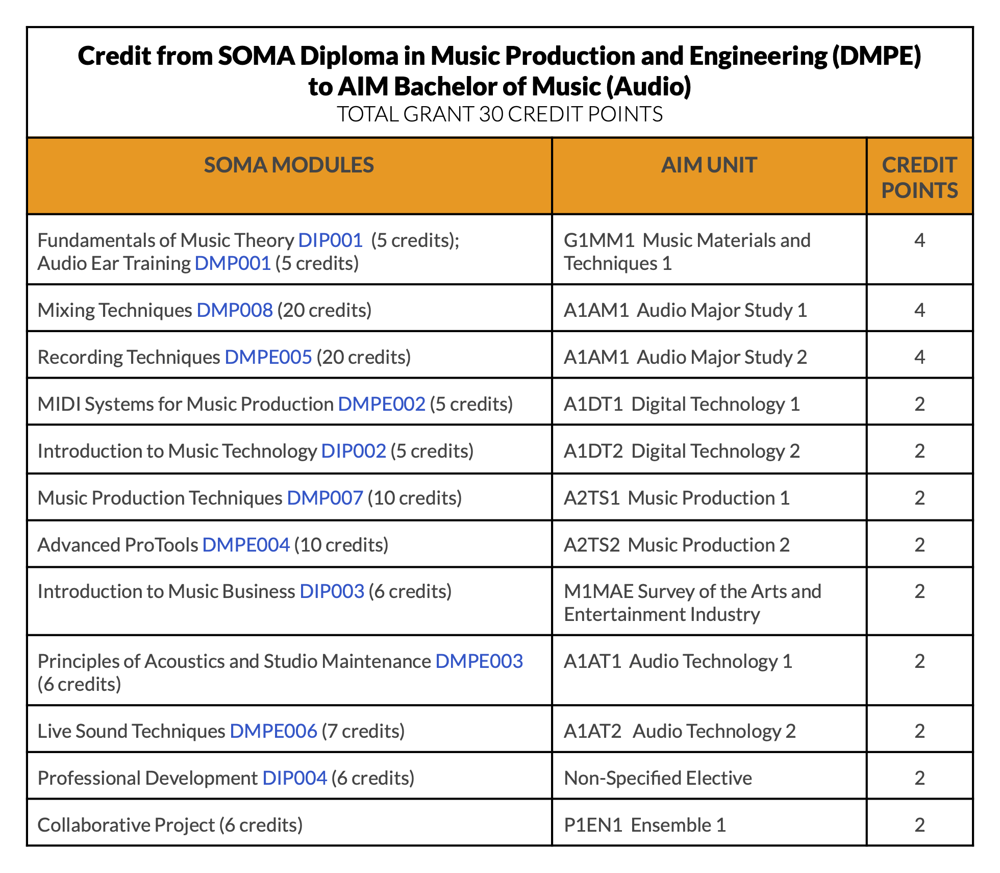 For the purposes of articulation to AIM, AIM has mapped the below SOMA courses to the below units in the AIM Bachelor of Music.